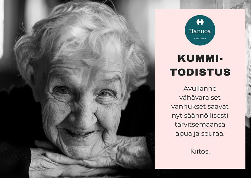 Siksi aloitimme yhteistyön Gubben (https://fi.gubbe.com) kanssa. Sen kautta löytyy yksinäiselle vanhukselle nuori ystävä, joka käy hänen luonaan säännöllisesti auttaen ulkoilussa ja kotiaskareissa. Näin vanhus saa apua ja seuraa, samalla nuori työllistyy merkityksellisen osa-aikatyön pariin.